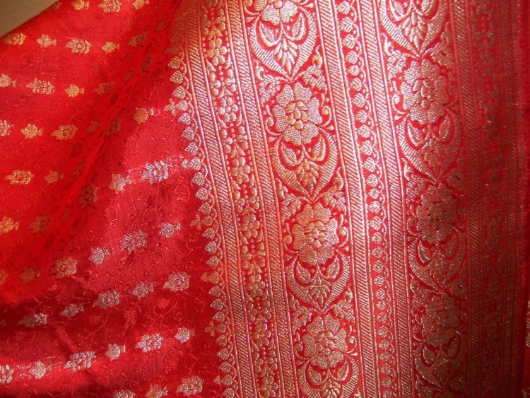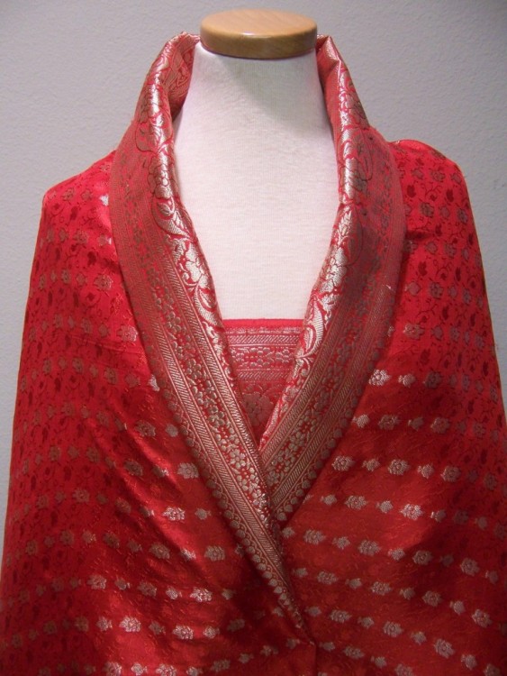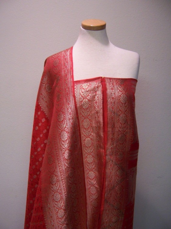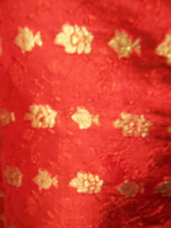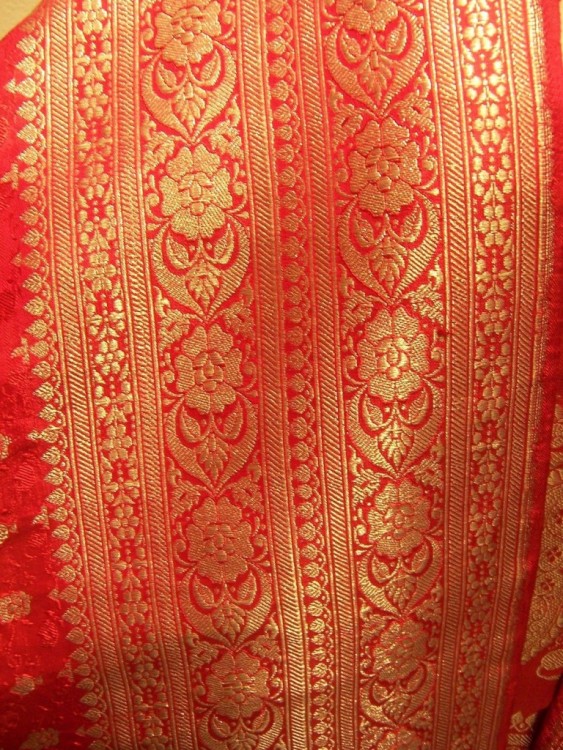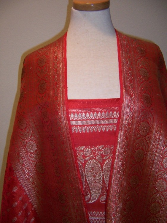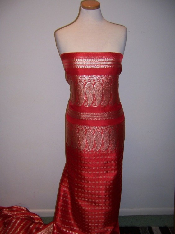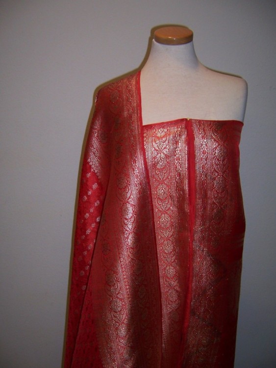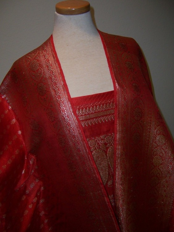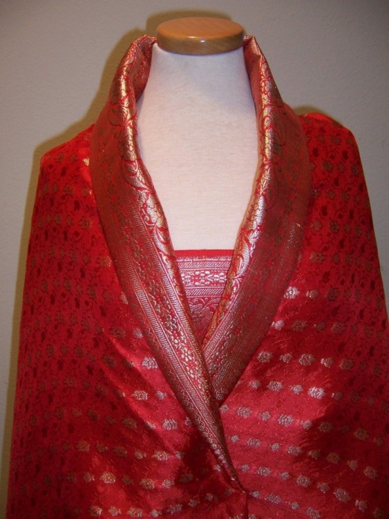 Are you familiar with Indian sarees ? They are quite amazing in that they have selvage borders and then a large border at one end that ends the panel. I used this large border for jacket fronts or sleeves or dress bodices. Take a little planning but the end results are spectacular !