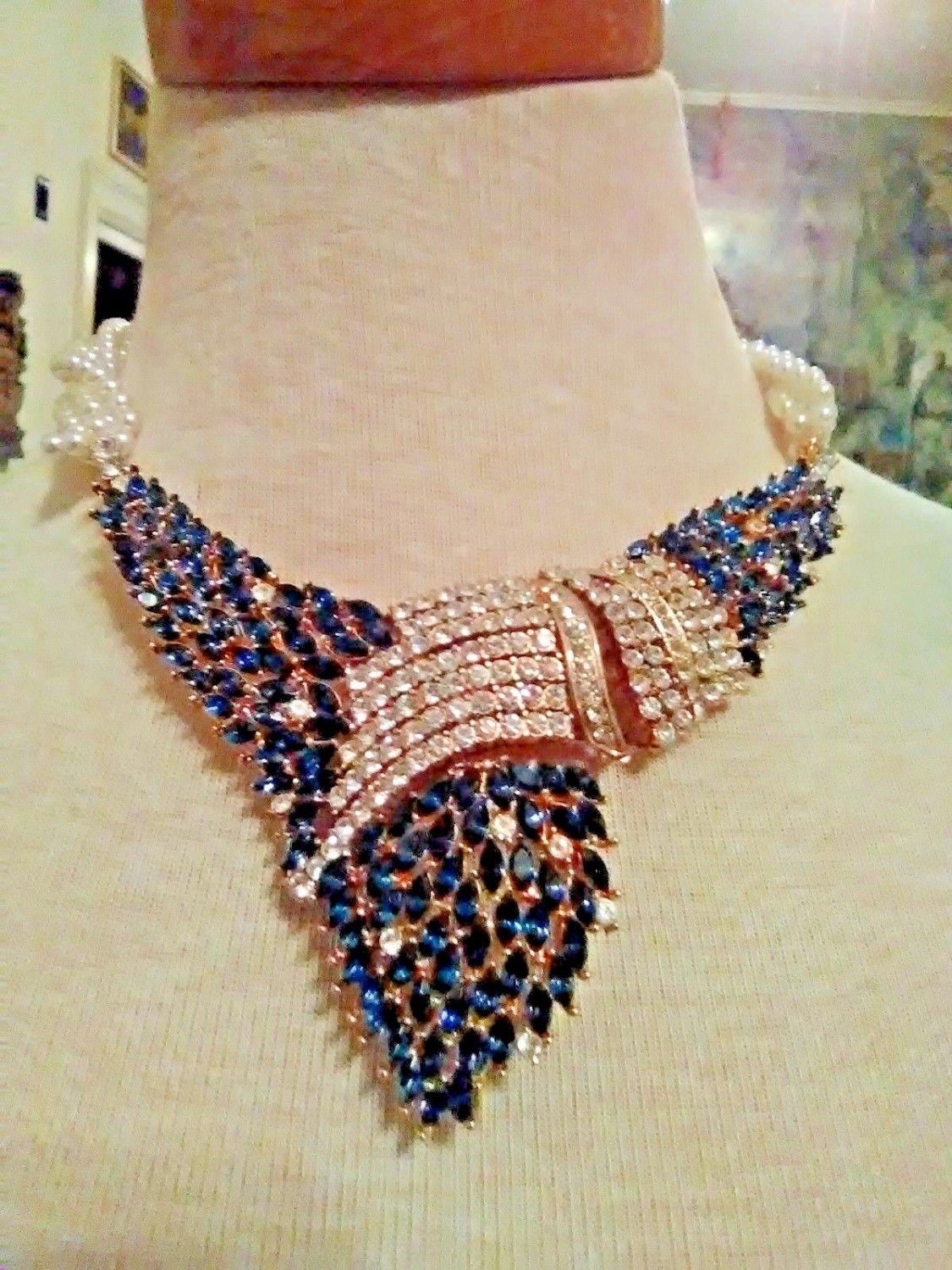 Drop dead gorgeous cascading design Faux blue sapphires and sparkling Rhinestones in a golden setting held by 6 strands of faux pearls.