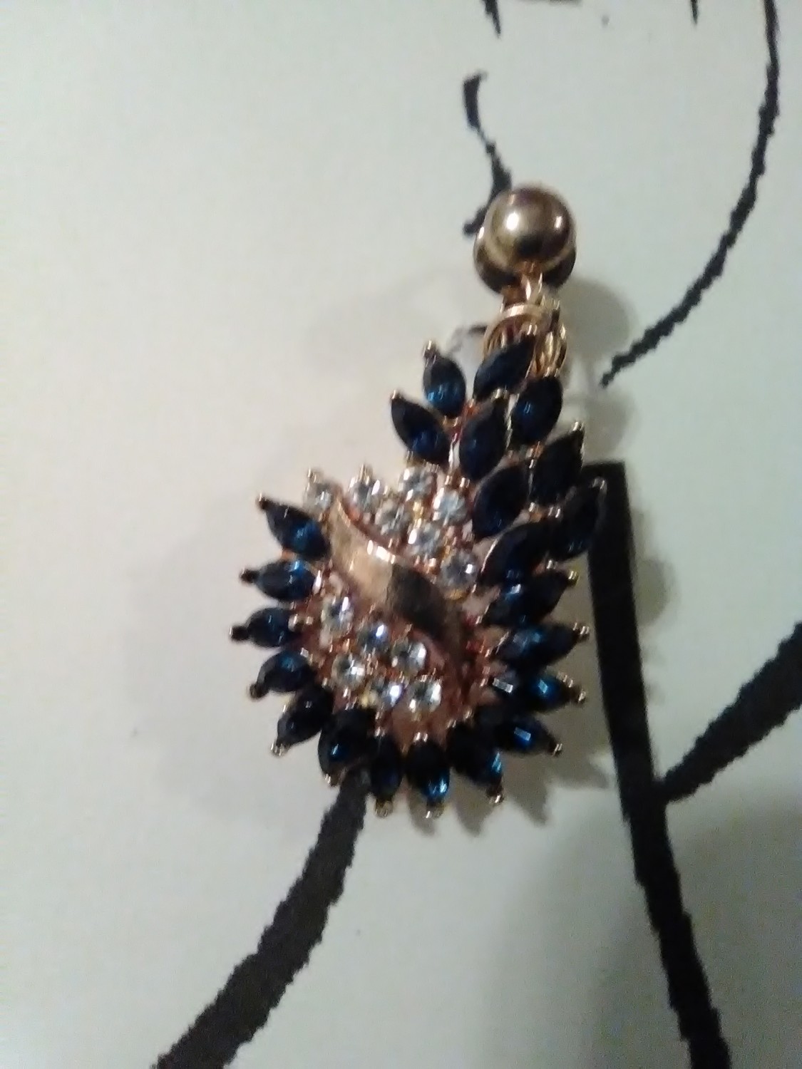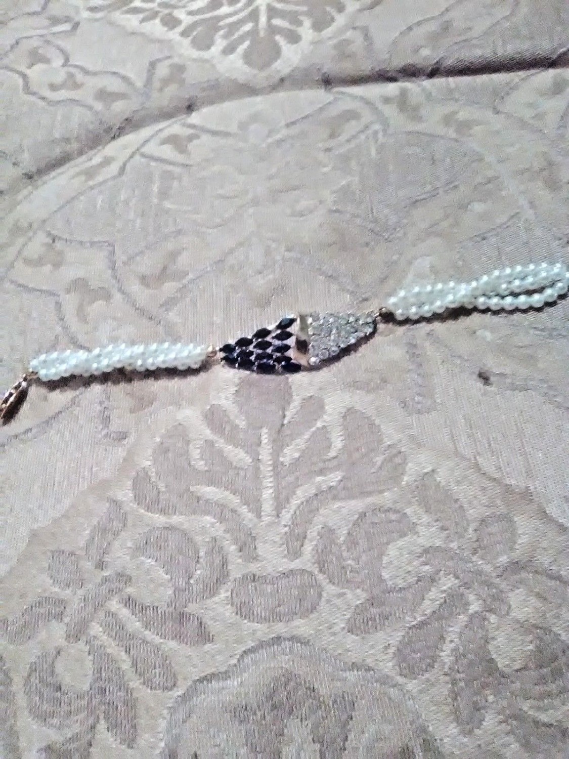Bracelet is a complementary design with faux blue sapphires, rhinestones & faux pearls