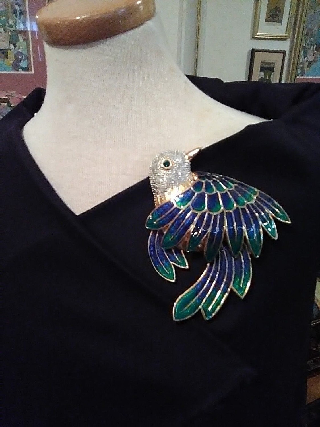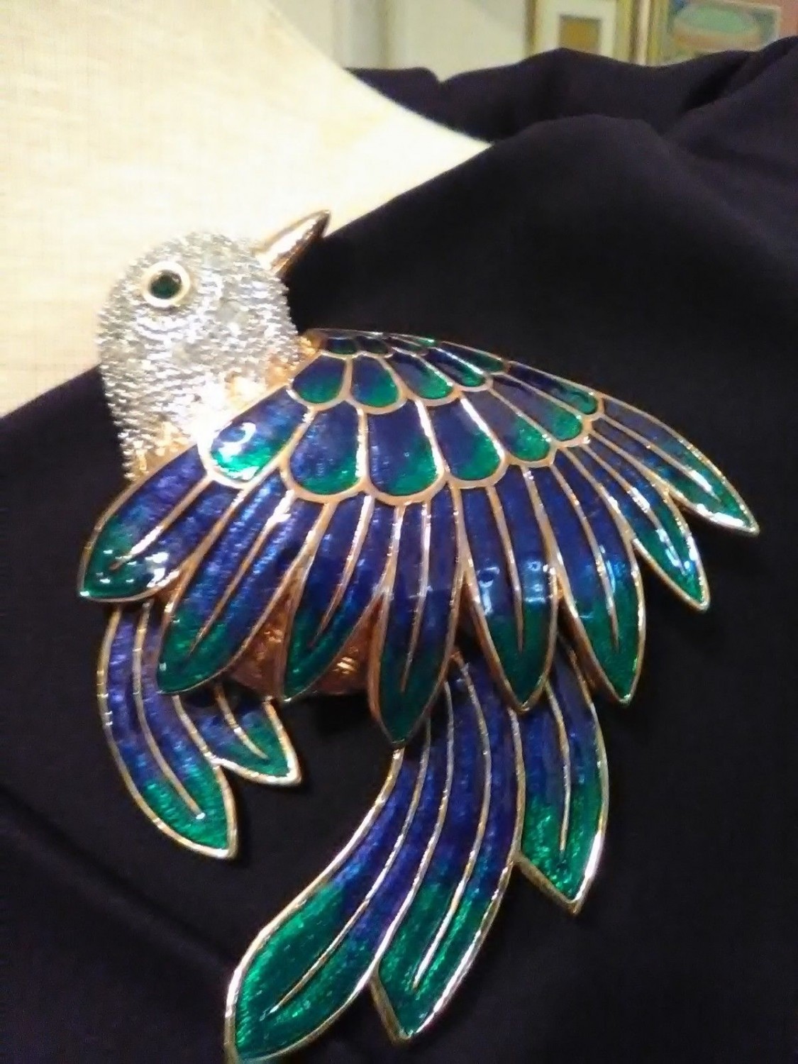 VINTAGE GOLDEN PIN BROOCH GORGEOUS BLUE GREEN ENAMELLED LOVE BIRD