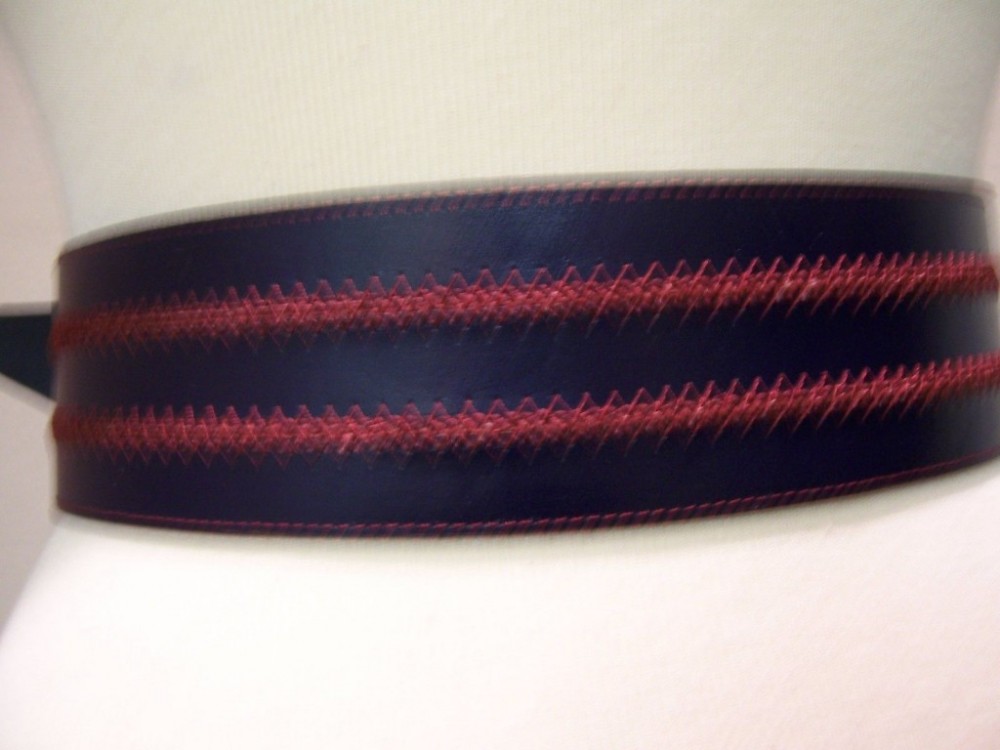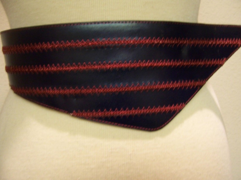 A Vintage Designer, very Chic belt in navy leather, accented with this burgundy piping , curves down in the front, giving a very slimming look! This belt is 4 inches at its widest and narrows to 2.5 inches. There is a hook on one side that fits into an eye for adjusting on the other side. This is a very lightweight belt and a very smart looking accessory. A great belt that is functional and beautiful !