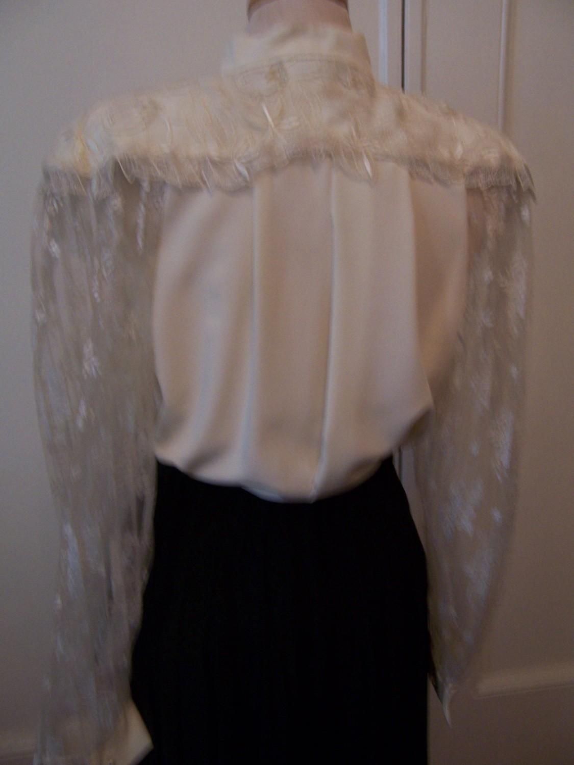 Gorgeous Off White Microfiber Georgette is fashioned into a pretty blouse with a yoke of Italiian Sposabella pearl accent lace & see through delicate Long lace sleeves A box pleat in back makes for added ease. When a blouse in a Chic style makes for an Entire understated elegant stylish look !