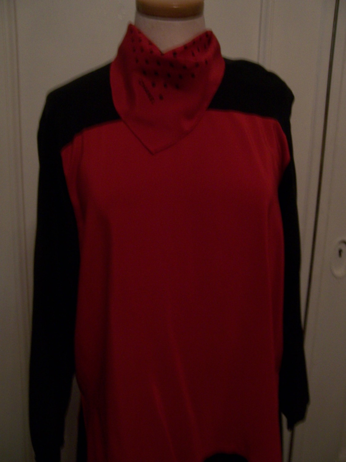 Gorgeous Red & Black pure silk split color blouse is accented by an attached silk scarf at the neck.