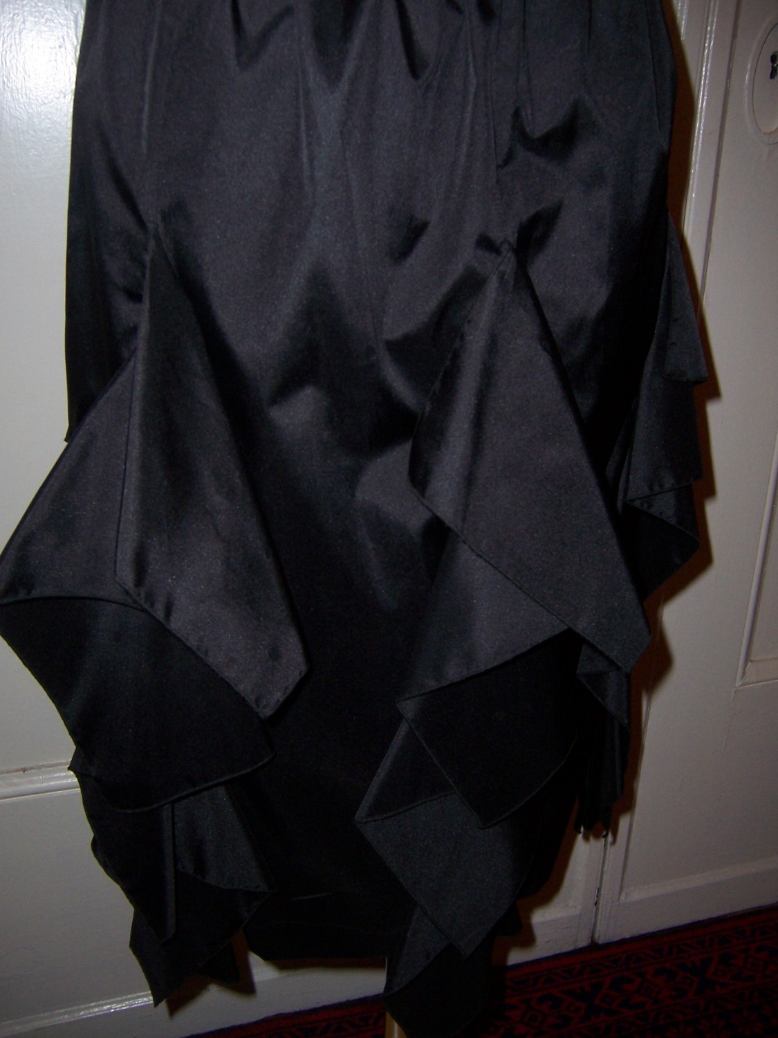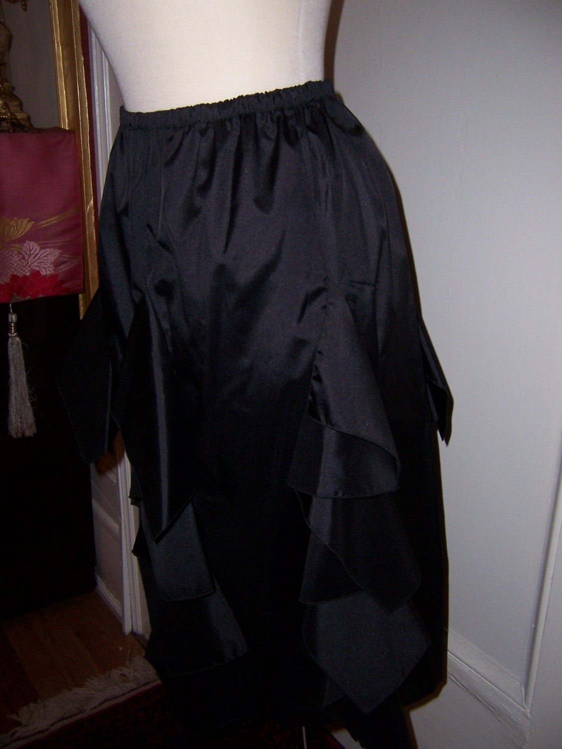 Gorgeous Black polyester tafetta is used to make this unlined, elastic waist 26 1/2inch long skirt..
