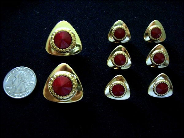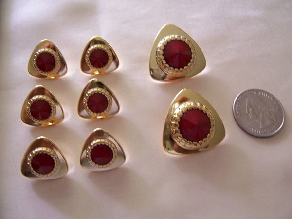 ITEM DESCRIPTION :A wonderful Designer accent, stunning gold triangular button with smooth rounded corners has a faceted center accent in Red ! There are 2 sizes available Makes a BIG BIG Statement ! A Gorgeous button ! A great closure that is functional and beautiful ! You can use this for the most stunning accent on jackets, skirts, pants, purses, picture frames, bags etc etc etc !!! With as many compliments as you will get , it will prove to be a great investment ! WIDTH : larger 1.12″ buttons Payment and Shipping Info |