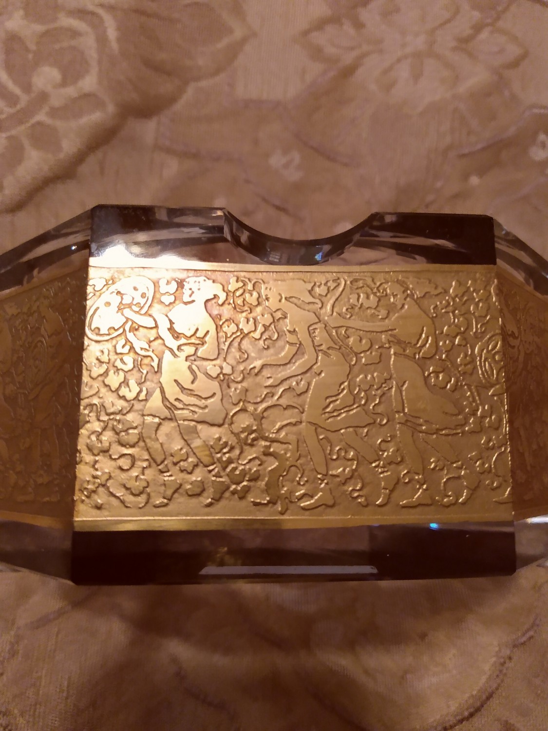 A FABULOUS Moser perfume atomiser in clear crystal with gilded detail ! The atomiser itself is panel cut & etched & gilded & finely polished using Hematite for an unequaled brilliance. The most incredible thing is that Moser uses no lead in its crystal & asttains the shine, clarity & brilliance thru salts ! This is acid etched & gilded with pure gold with the Amazonia design wide border. Absolutely immaculate condition w/ Mosers box .